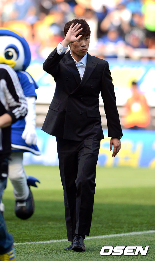 20일 오후 수원월드컵경기장에서 열린 '현대오일뱅크 K리그 2012' 수원 삼성과 울산 현대의 경기 하프타임 시간에 박지성이 그라운드를 돌려 팬들에게 사인볼을 나눠주며 인사를 하고 있다.