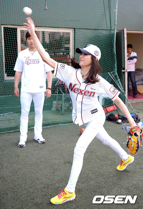 20일 서울 목동야구장에서 벌어진 '2012 팔도 프로야구' 넥센 히어로즈와 삼성 라이온즈의 경기 전 시구를 위해 경기장을 찾은 황인영이 손승락의 지도하에 시구 연습을 하고 있다.
