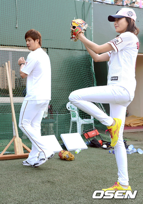 20일 서울 목동야구장에서 벌어진 '2012 팔도 프로야구' 넥센 히어로즈와 삼성 라이온즈의 경기 전 시구를 위해 경기장을 찾은 황인영이 손승락의 지도하에 시구 연습을 하고 있다.