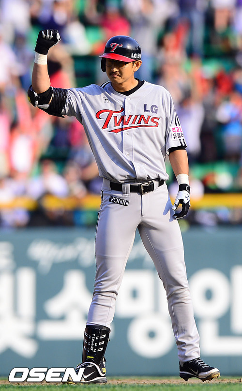 20일 오후 서울 잠실구장에서 열리는 2012 팔도 프로야구 두산 베어스와 LG 트윈스의 경기 2회초 2사 만루 LG 박용택이 주자일소 3타점 적시타를 날린후 주먹을 쥐고 있다.