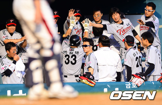 20일 오후 서울 잠실구장에서 열리는 2012 팔도 프로야구 두산 베어스와 LG 트윈스의 경기 2회초 2사 2루 LG 이대형의 1타점 적시타때 2루 주자 박용택이 홈을 밟은 후 동료들의 축하를 받고 있다. 박용택은 이번 타석에서 3타점 적시타를 기록했다.