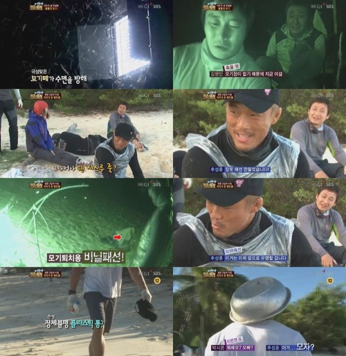 불을 피워 낸 연기를 온 몸에 흡수시키고 모래를 이불삼아 덮어 찜질하며 잤지만 야생 모기의 습격은 만만치 않았다. 결국 견디다 못한 추성훈은 쓰레기 비닐을 이용한 옷을 입는 방법을 택했다.