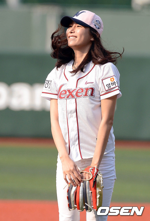 20일 서울 목동야구장에서 벌어진 '2012 팔도 프로야구' 넥센 히어로즈와 삼성 라이온즈의 경기 시구를 마친 황인영이 환하게 웃으며 인사를 하고