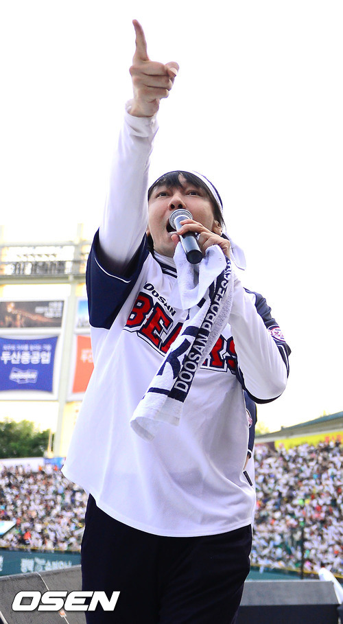 20일 오후 서울 잠실구장에서 열리는 2012 팔도 프로야구 두산 베어스와 LG 트윈스의 경기 클리닝 타임때 가수 김장훈이 응원 단상에서 축하무대를 펼치고 있다