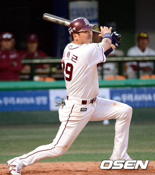 20일 서울 목동야구장에서 벌어진 '2012 팔도 프로야구' 넥센 히어로즈와 삼성 라이온즈의 경기 8회말 1사 이택근이 2루타를 치고 있다.
