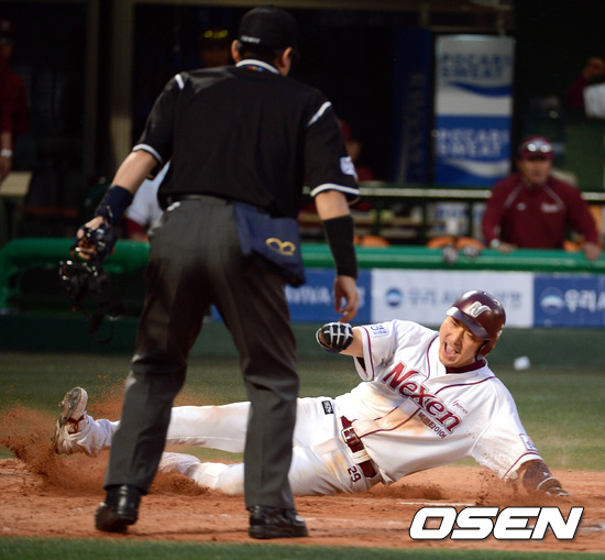 20일 서울 목동야구장에서 벌어진 '2012 팔도 프로야구' 넥센 히어로즈와 삼성 라이온즈의 경기 8회말 2사 2루 강정호의 안타때 이택근이 홈에서 세이프 되며 환호하고 있다.