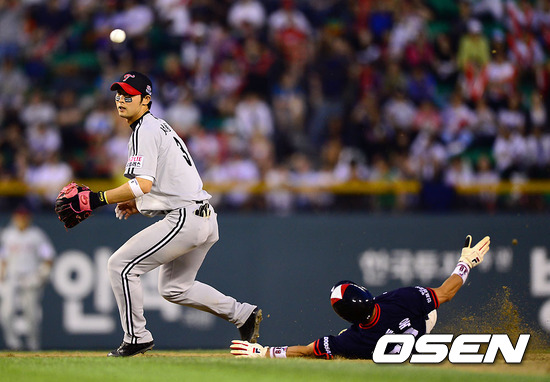 20일 오후 서울 잠실구장에서 열린 2012 팔도 프로야구 두산 베어스와 LG 트윈스의 경기 8회말 1사 1루 두산 양의지의 내야땅볼때 LG 오지환 유격수가 송구 실책을 했다. 서동욱 2루수가 공을 바라보고 있다.