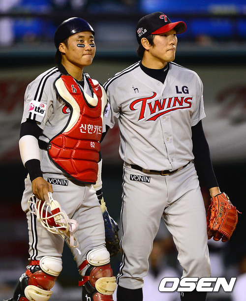 20일 오후 서울 잠실구장에서 열린 2012 팔도 프로야구 두산 베어스와 LG 트윈스의 경기 8회말 1사 2,3루 두산 오재원의 타석때 LG 유원상 투수가 폭투를 하며 동점을 허용했다. 유원상 투수와 김태군 포수가 아쉬워하고 있다.