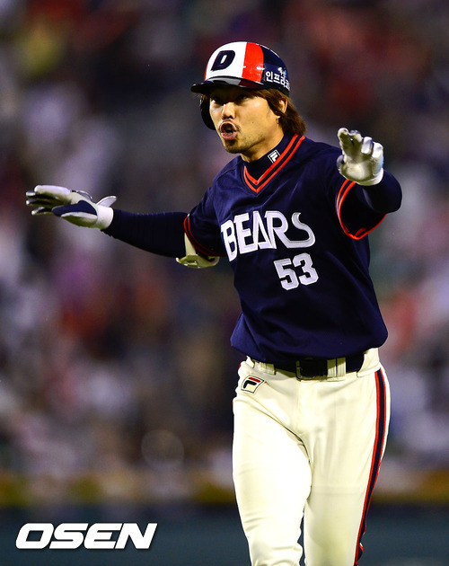 20일 오후 서울 잠실구장에서 열린 2012 팔도 프로야구 두산 베어스와 LG 트윈스의 경기 8회말 1사 3루 두산 오재원이 외야 플라이아웃된 후 아쉬워하고 있다