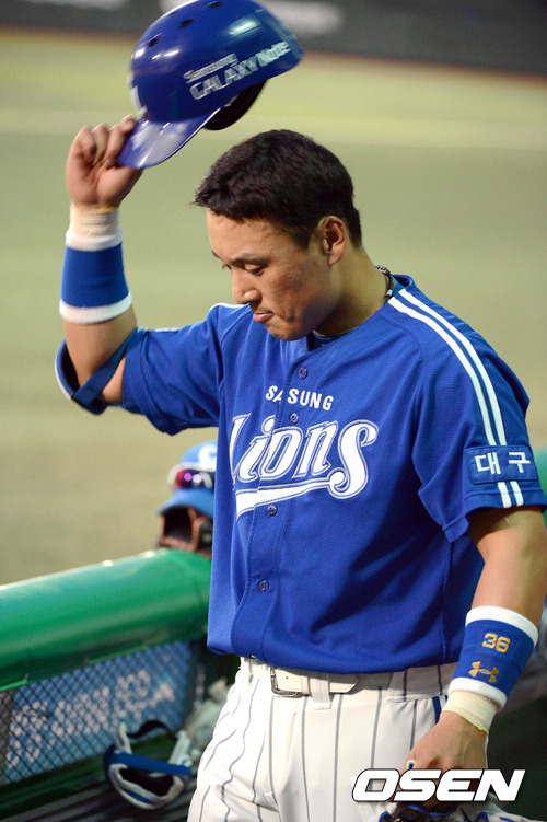 경기에 패한 삼성 이승엽이 9회초 타석에서 내야플라이로 물러난 후 덕아웃에서 헬멧을 던지는 시늉을 하고 있다. /spjj@osen.co.kr