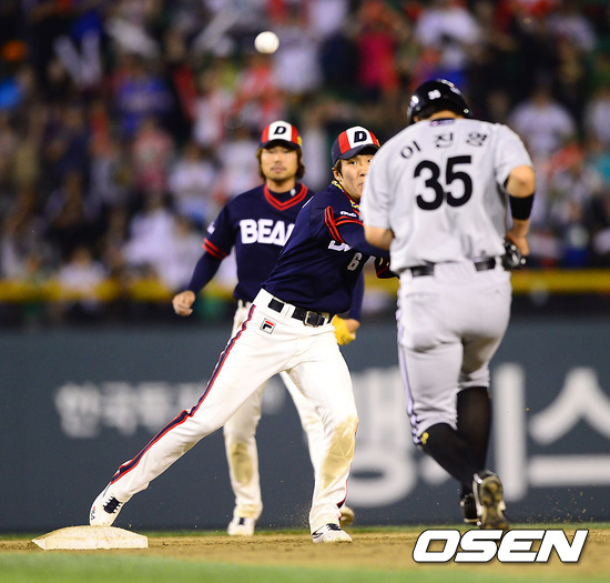 20일 오후 서울 잠실구장에서 열린 2012 팔도 프로야구 두산 베어스와 LG 트윈스의 경기 9회초 1사 만루 LG 정성훈의 내야땅볼을 두산 허경민 2루수가 병살 플레이를 성공하고 있다