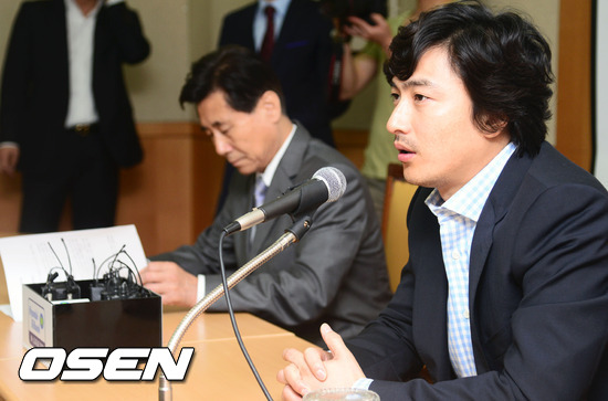 기자회견에서 안정환이 질의 응답 시간을 갖고 있다.
