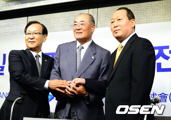 이재환 일구회 회장,장훈 일본 레전드 단장,김인식 한국 레전드 감독이 악수를 나누고 있다. /spjj@osen.co.kr