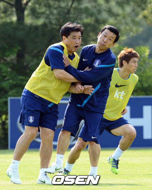 최강희 감독이 미니게임중 최덕주 코치에게 반칙을 범하고 있다./ajyoung@osen.co.kr