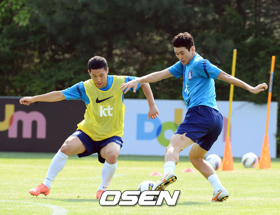 미니게임 훈련에서 이정수, 남태희가 볼다툼을 벌이고 있다./ajyoung@osen.co.kr