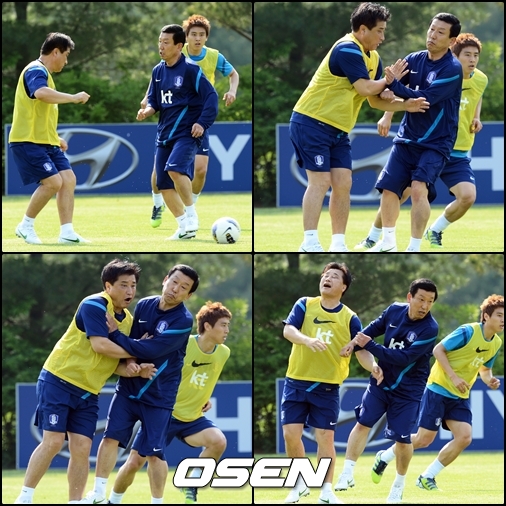미니게임 훈련에서 최강희 감독이 최덕주 코치에게 반칙을 범하고 있다./ ajyoung@osen.co.kr