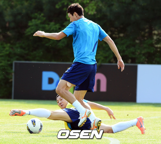 미니게임 훈련에서 남태희가 이정수에 앞서 수비를 펼치고 있다./ ajyoung@osen.co.kr