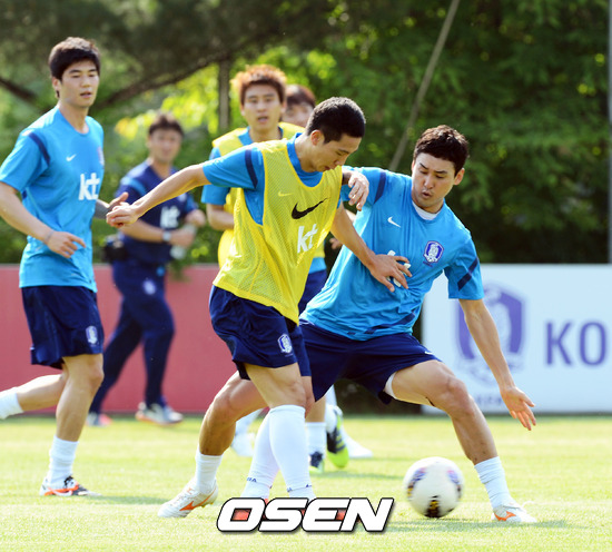 미니게임 훈련에서 남태희가 이정수의 수비에 앞서 공을 패스하고 있다./ ajyoung@osen.co.kr