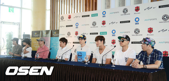 박지성(맨체스터 유나이티드)이 설립한 사회공헌재단 제이에스 파운데이션 주최로 국내외 유명 축구선수들이 참가하는 태국 자선경기 '제2회 아시안 드림컵'의 성공적인 개최를 위해 21일 오후 김포 아라마리나 컨벤션에서 열린 출정식에서 박지성과 런닝맨 출연진이 인사말을 하고 있다.
