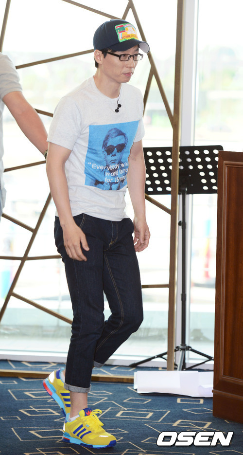 박지성(맨체스터 유나이티드)이 설립한 사회공헌재단 제이에스 파운데이션 주최로 국내외 유명 축구선수들이 참가하는 태국 자선경기 '제2회 아시안 드림컵'의 성공적인 개최를 위해 21일 오후 김포 아라마리나 컨벤션에서 열린 출정식에서 유재석이 입장 하고 있다.