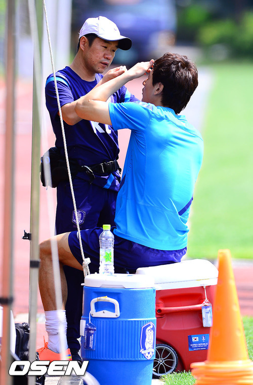 22일 오후 경기 파주시 파주NFC(국가대표 트레이닝센터)에서 진행된 축구대표팀 훈련에서 지동원이 눈에 안약을 넣고 있다.
