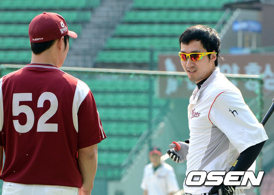 22일 오후 서울 잠실구장에서 열리는 ' 2012 팔도 프로야구' LG 트윈스와 넥센 히어로즈의 경기전 LG 정성훈이 넥센 박병호에게 선글라스를 건내 받아 선글라스를 착용하고 있다.