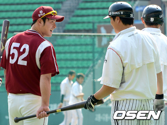 22일 오후 서울 잠실구장에서 열리는 ' 2012 팔도 프로야구' LG 트윈스와 넥센 히어로즈의 경기전 LG 이진영이 넥센 박병호와 배트를 가지고 장난을 치고 있다.