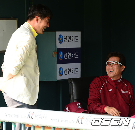 22일 오후 서울 잠실구장에서 열린 '2012 팔도 프로야구' LG 트윈스와 넥센 히어로즈의 경기, 경기전 이숭용 XTM 해설위원과 넥센 김시진 감독이 이야기를 나누고 있다.