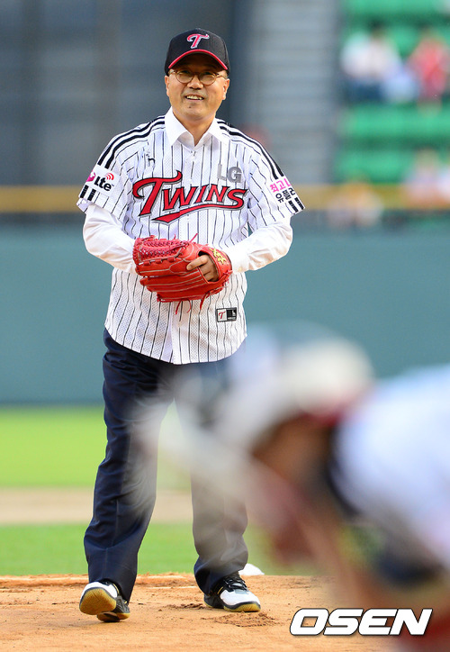 22일 오후 서울 잠실구장에서 열린 '2012 팔도 프로야구' LG 트윈스와 넥센 히어로즈의 경기, 경기전 프로야구 메인 스폰서 팔도 최재문 대표이사가 시구를 마치고 미소짓고 있다.