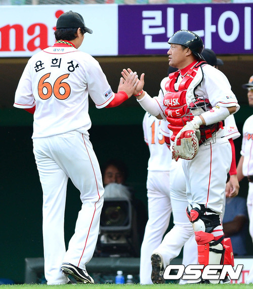 22일 오후 인천 문학구장에서 열린 '2012 팔도 프로야구' SK 와이번스와 두산 베어스의 경기 2회초 2사 1,2루 윤희상이 타석에 손시헌을 삼진아웃 시키고 덕아웃으로 향하면서 조인성과 하이파이브를 하고 있다.