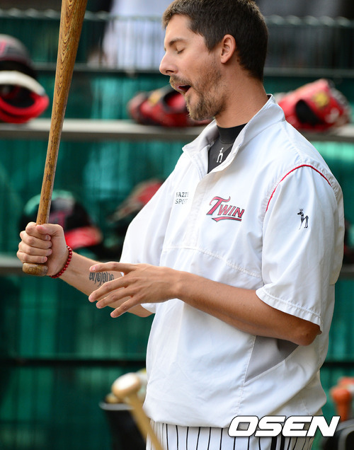 22일 오후 서울 잠실구장에서 열린 '2012 팔도 프로야구' LG 트윈스와 넥센 히어로즈의 경기, 경기전 LG 주키치가 더그아웃에서 배트를 들고 타격자세를 잡고 있다.