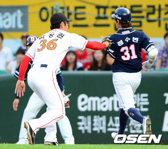 22일 오후 인천 문학구장에서 열린 '2012 팔도 프로야구' SK 와이번스와 두산 베어스의 경기 3회초 1사 1루 정수빈이 번트를 시도했지만 1루수에 태그아웃 되고 있다. 그사이 1루주자 이종욱은 2루로 진루.