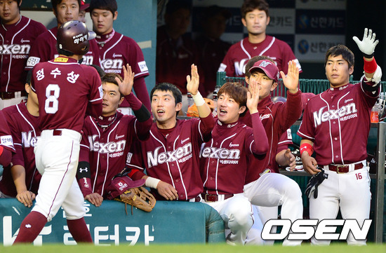 22일 오후 서울 잠실구장에서 열린 '2012 팔도 프로야구' LG 트윈스와 넥센 히어로즈의 경기, 3회초 2사 2루에서 넥센 이택근의 선제 1타점 적시타에 홈을 밟은 정수성이 더그아웃에서 동료선수들의 축하를 받고 있다.