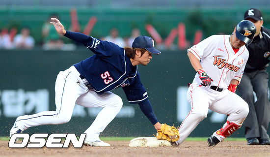 22일 오후 인천 문학구장에서 열린 '2012 팔도 프로야구' SK 와이번스와 두산 베어스의 경기 3회말 2사 정근우가 좌익수 왼쪽 2루타를 친 후 2루에서 세이프 되고 있다.