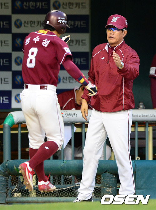 22일 오후 서울 잠실구장에서 열린 '2012 팔도 프로야구' LG 트윈스와 넥센 히어로즈의 경기, 3회초 2사 2루에서 넥센 이택근의 선제 1타점 적시타에 홈을 밟은 정수성이 김시진 감독과 하이파이브를 하고 있다.