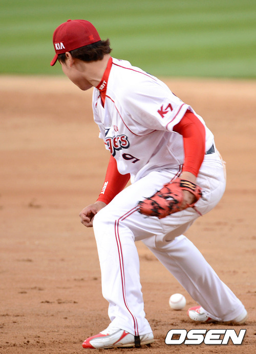 22일 오후 광주 무등야구장에서 열린 '2012 팔도 프로야구' KIA 타이거즈와 한화 이글스의 경기, 3회초 1사 2루 KIA 김주형이 한화 양성우의 타구를 놓치고 있다.
