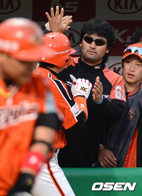 22일 오후 광주 무등야구장에서 열린 '2012 팔도 프로야구' KIA 타이거즈와 한화 이글스의 경기, 3회초 1사 1,3루 한화 장성호의 선제 1타점 적시타때 한화 박찬호가 홈을 밟은 3루주자 강동우를 축하하고 있다.