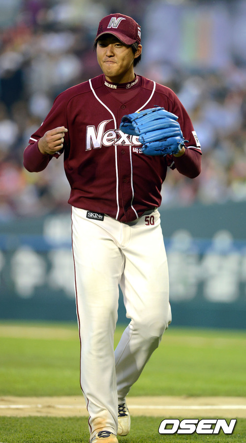 22일 오후 서울 잠실구장에서 열린 ' 2012 팔도 프로야구' LG 트윈스와 넥센 히어로즈의 경기 3회말 넥센 김영민이 무실점으로 이닝을 끝내고 덕아웃으로 들어오면서 기뻐하고 있다.
