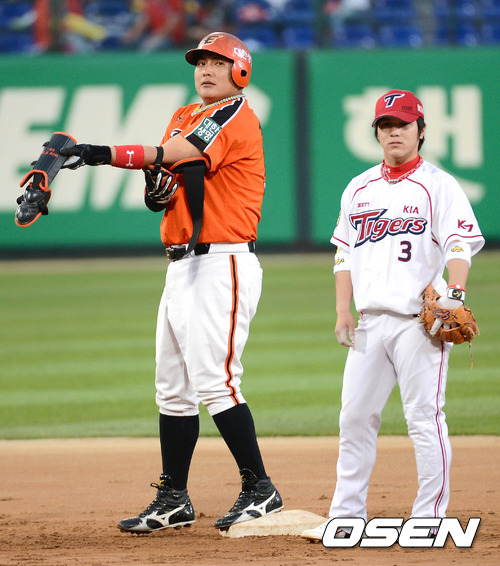 22일 오후 광주 무등야구장에서 열린 '2012 팔도 프로야구' KIA 타이거즈와 한화 이글스의 경기, 3회초 1사 1루 한화 김태균이 1타점 적시타를 치고 팔꿈치 보호대를 벗고 있다.