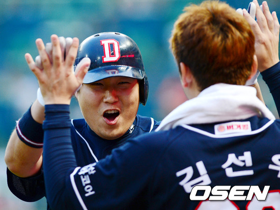 22일 오후 인천 문학구장에서 열린 '2012 팔도 프로야구' SK 와이번스와 두산 베어스의 경기 4회초 선두타자 양의지가 솔로포를 치고 덕아웃에서 김선우와 하이파이브를 하고 있다.