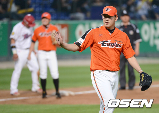 22일 오후 광주 무등야구장에서 열린 '2012 팔도 프로야구' KIA 타이거즈와 한화 이글스의 경기, 3회말 무사 2루 KIA 김주형의 희생번트때 한화 양훈이 포수 정범모를 향해 사인을 보내고 있다.