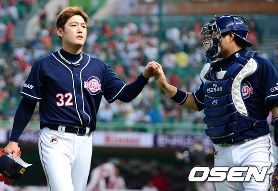 22일 오후 인천 문학구장에서 열린 '2012 팔도 프로야구' SK 와이번스와 두산 베어스의 경기 4회말을 마치고 김선우가 덕아웃으로 향하면서 양의지와 하이파이브를 하고 있다.