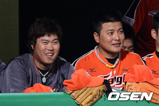 22일 오후 광주 무등야구장에서 열린 '2012 팔도 프로야구' KIA 타이거즈와 한화 이글스의 경기, 5회초 2사 한화 양성우 타석때 류현진과 김태균이 더그아웃에서 미소를 지으며 경기를 바라보고 있다.