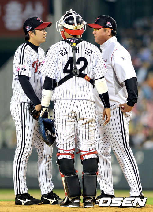 22일 오후 서울 잠실구장에서 열린 ' 2012 팔도 프로야구' LG 트윈스와 넥센 히어로즈의 경기 6회초 1사 LG 차명석 코치가 마운드에 올라 이승우와 이야기를 하고 있다.