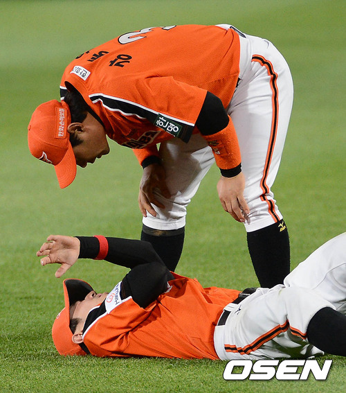 22일 오후 광주 무등야구장에서 열린 '2012 팔도 프로야구' KIA 타이거즈와 한화 이글스의 경기, 5회말 무사 한화 강동우가 KIA 나지완의 타구를 잡다 넘어져 고통스러워하는 한상훈을 살피고 있다.