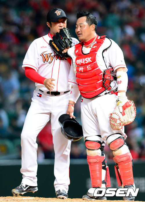 22일 오후 인천 문학구장에서 열린 '2012 팔도 프로야구' SK 와이번스와 두산 베어스의 경기 6회초 교체된 임경완이 마운드에서 조인성과 이야기를 하고 있다.