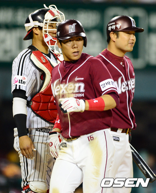 22일 오후 서울 잠실구장에서 열린 '2012 팔도 프로야구' LG 트윈스와 넥센 히어로즈의 경기, 6회초 2사 1,3루에서 넥센 강정호가 LG 김기표의 1루 악송구에 홈을 밟고 있다.