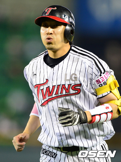 22일 오후 서울 잠실구장에서 열린 '2012 팔도 프로야구' LG 트윈스와 넥센 히어로즈의 경기, 6회말 2사 2루에서 LG 정성훈이 내야땅볼로 물러나며 아쉬워하고 있다.