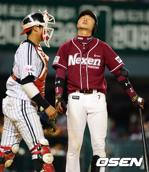 22일 오후 서울 잠실구장에서 열린 '2012 팔도 프로야구' LG 트윈스와 넥센 히어로즈의 경기, 6회초 1사 1,3루에서 넥센 김민우가 삼진을 당하며 아쉬워하고 있다.