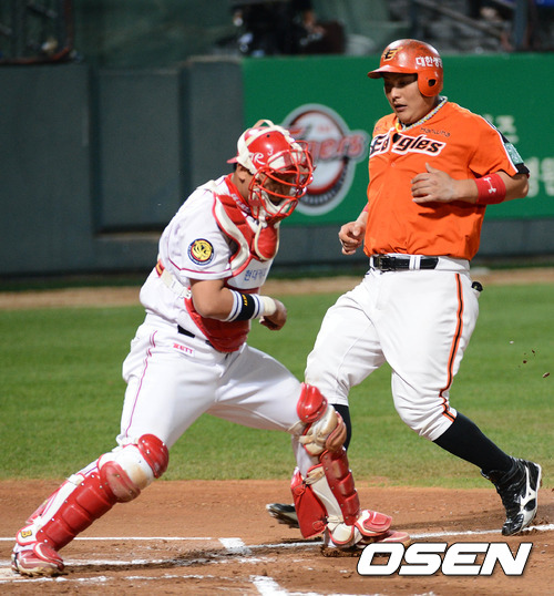 22일 오후 광주 무등야구장에서 열린 '2012 팔도 프로야구' KIA 타이거즈와 한화 이글스의 경기, 6회초 1사 만루 한화 하주석의 내야안타때 3루주자 김태균이 포스 아웃 되고 있다.